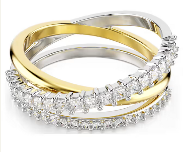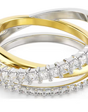 Questo anello Hyperbola intrecciato integra più stili in un unico design meravigliosamente complesso. L’anello è composto da tre fasce in un mix di finiture in tonalità oro e argento, impreziosite da Swarovski Zirconia taglio Round...
