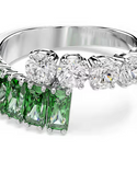 Questo ipnotico anello a fascia presenta una collisione di colori e forme. La fascia sovrapposta è placcata rodio con Swarovski Zirconia trasparenti e verdi con tagli Round e Baguette. Una scelta vivace che si abbina...