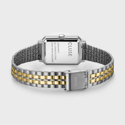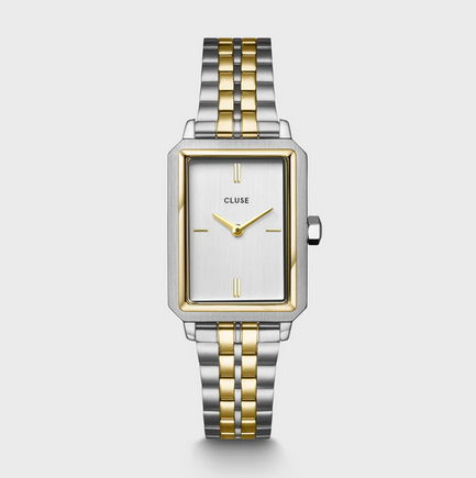 L'orologio rettangolare Fluette da donna presenta una cassa bicolore oro e argento da 30.6 mm, un quadrante bianco spazzolato e un cinturino in acciaio inox bicolore oro e argento a 5 maglie da 14 mm.