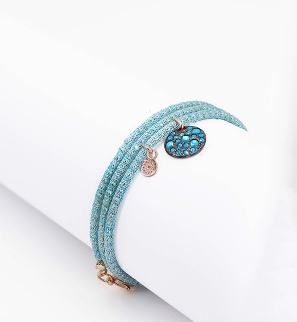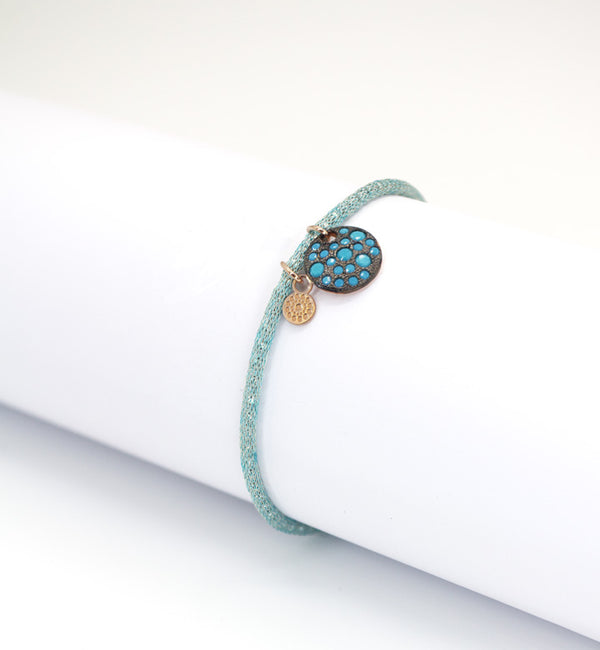 Bracciale Shinny realizzato con una catena a pallina interna in ottone, rivestita da una maglia in rame colorato con pendente realizzato a mano in ag925 con zirconi turchesi.