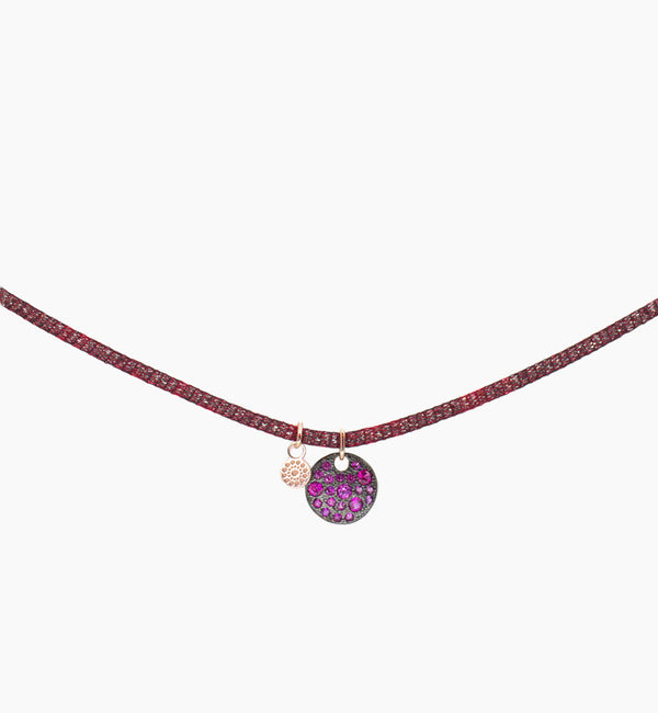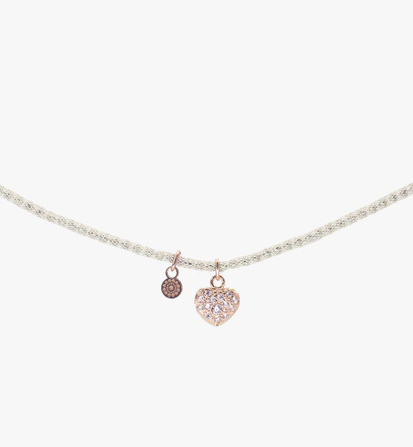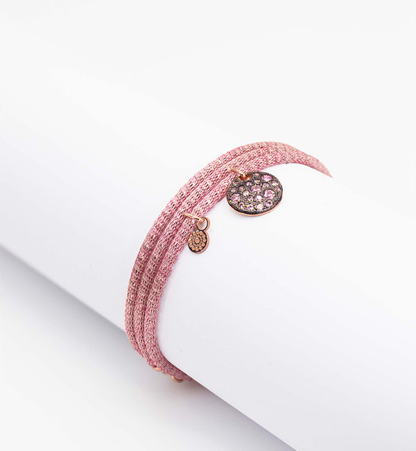 Bracciale Shinny realizzato con una catena a pallina interna in ottone, rivestita da una maglia in rame colorato con pendente realizzato a mano in ag925 con zirconi rosa.