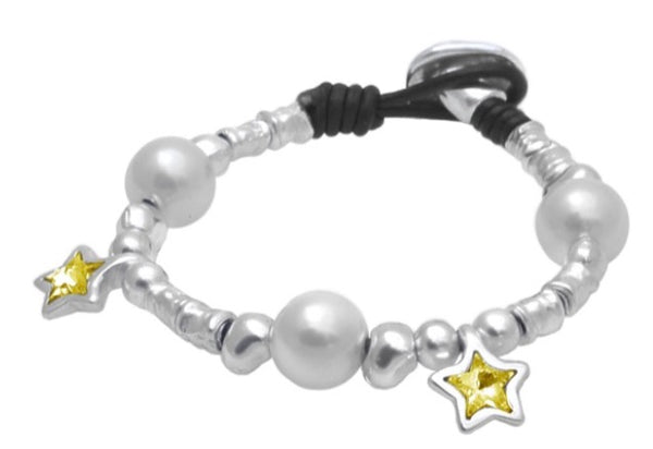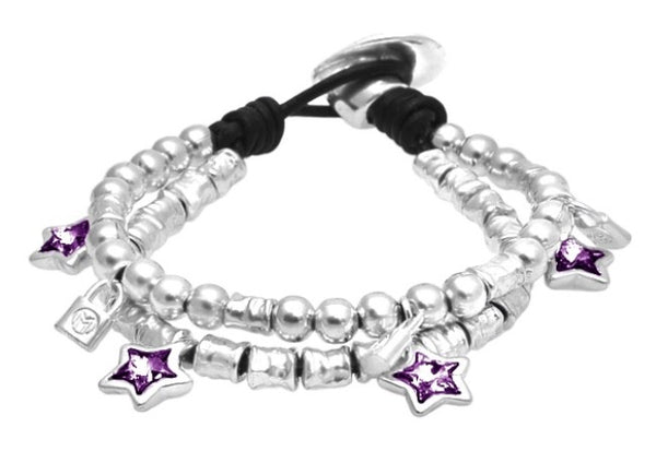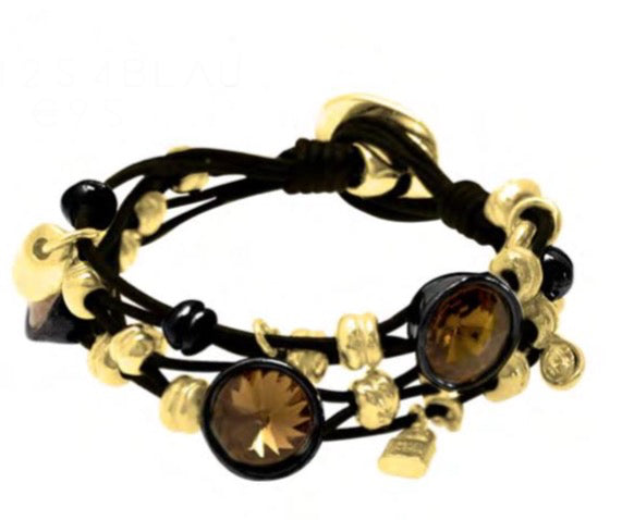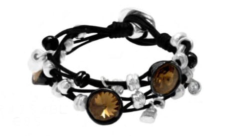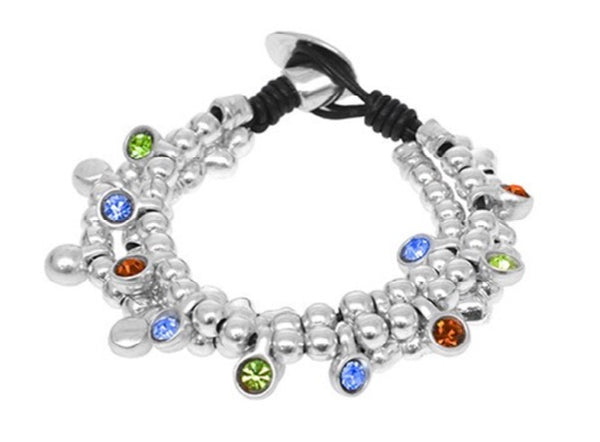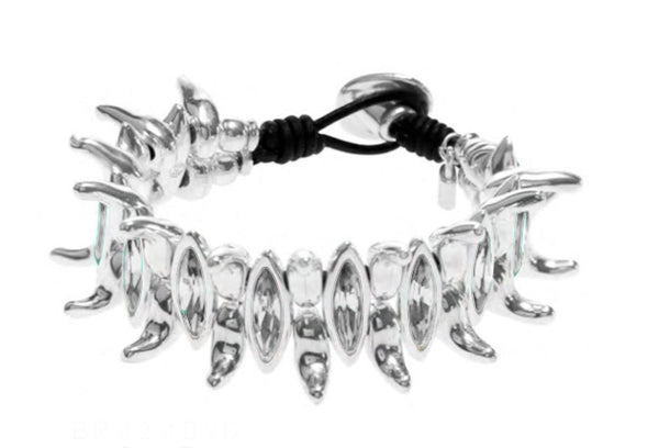 Bracciale multifilo in pelle con elementi rivestiti in argento 925°°° e Swarovski. Accessorio dalle forme irregolari capace di arricchire anche il look più casual.
