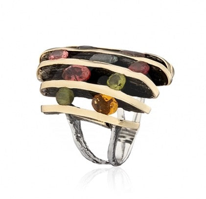 Anello in argento con linee dorate asimmetriche e tormaline multicolori. Puoi abbinarlo anche alla collana dalle linee asimmetriche e alla tormalina.