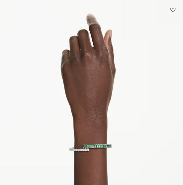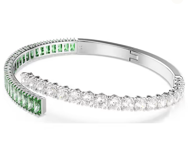 Colorato, energico ed espressivo, questo bangle Matrix è un modo gioioso per giocare con gli accessori. La fascia sovrapposta è placcata rodio e presenta Swarovski Zirconia trasparenti e verdi con tagli Round e Baguette. Una scelta vivace che si abbina splendidamente all’anello e agli orecchini coordinati.
