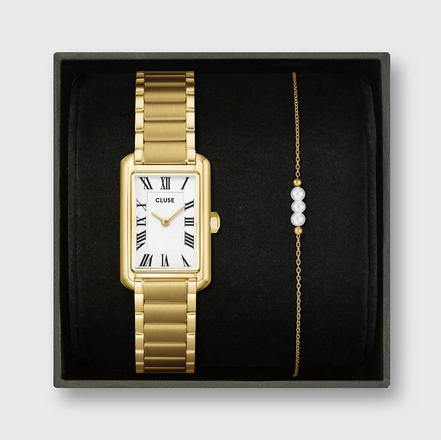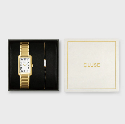 Questa confezione regalo CLUSE da donna abbina l'orologio Belisenna al bracciale Pearl Chain color oro. L'orologio Belisenna è dotato di quadrante bianco, cassa color oro da 21 mm e cinturino in acciaio inossidabile a 3 maglie. Abbina l’orologio al bracciale dorato coordinato.